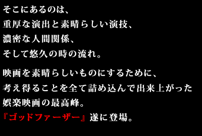 ドン・ヴィト・コルレオーネ。彼を頂点とするコルレオーネ・ファミリー。彼らの繋がり、その身に降りかかる危機、悲しみ、別れ、そして世代交代が、激しい愛憎をもって描かれる。はたして“ドン”とはいかなる存在なのか?マフィアとはどのような組織なのか?それまでタブー視されていた世界を見事にフィルムに焼き付け、高い評価を得たシリーズ第1作。映画史に残る数々の名シーンに彩られた、長き抗争の幕開け。