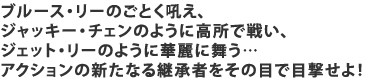 “ノンストップの生傷アクション!”を謳い文句に、ノースタント・ノーワイヤーで暴れ回ります。