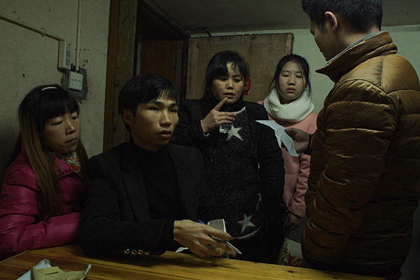 しかしたやすいとは言っても、賃金は出来高制で半年分を後払いでしかもらえないシステム、しかも高給取りではない現状があります。『苦』は、工員と社長とのひりつくような賃金交渉など、そうした中でたびたび起こる金銭の苦い営みにフォーカスしています。ある若い工員は、地元政府が織里の零細企業に打ち出した一方的な増税に端を発する“暴動”、2011年の織里事件をカメラに向かって話し始めるのでした。「いくらカネを稼いでも権力のある奴にはかなわない」。社長が金を持ち逃げしたせいで工場が維持できなくなり、電気を止められた暗い部屋で寝転がりながらそう呟く青年に注がれるワン・ビンのまなざしには、都市部で暮らすある程度の富裕層からは全く無いものにされている、出稼ぎ労働者の彼ら彼女たちの人生を決してなおざりにはしない態度が見て取れます。