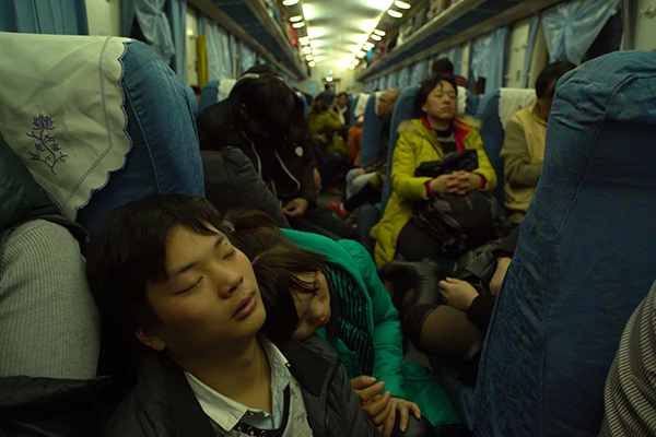 『帰』は、一年のほとんどを出稼ぎに費やし、それでも仕事先に定住できない工員たちにとって最も大切な季節・春節の様相を捉えています。帰郷した工員たちの表情は、脱ぎっぱなしの我が子のパジャマを畳む親や、食卓を囲みあれこれ言い募る息子や娘の顔へとしばし戻っていきます。山間で開かれる結婚式や家族団らんの風景はたしかに穏やかそのものである一方、ある家族の会話からは、中国当局が如何に村民に圧政を強いているか、村が窮状に陥っているかといった政治的問題がまたもや浮かび上がります。ある女性工員は「これからどうやって生きていけばいいのか」と悩みを吐露しながらも、再び織里の出稼ぎへと戻っていくのでした。こうしてある世代を貫いている決して楽とは言えない現状が浮き彫りになります。